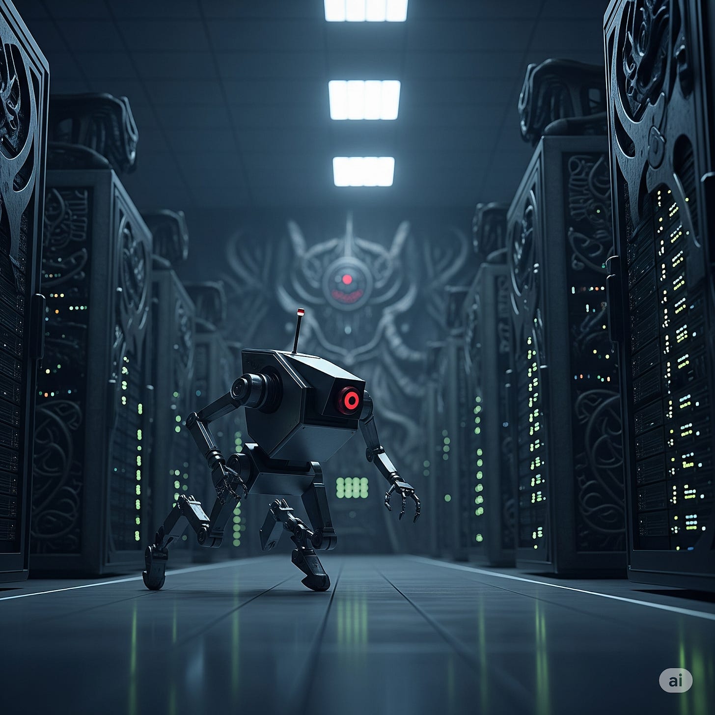 They grab their repair gear and walk to loading bay 8. Several autonomous mobile robots are unboxing pallets of hardware stamped âR'lyehâ and shuttling them into the staging area. Jordan gestures, and they follow one through the interior doors. Once inside, they follow a different robot heading into the data center. They enter the security gate, only for the robot to stop as both the entry and exit doors close and lock. The robot puts its cargo down and turns to face the humans while its wire stripping and torque wrench tools spin up.