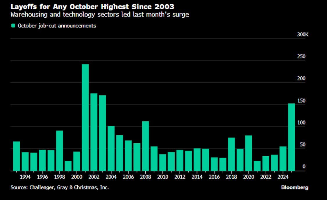 American companies cut over 150,000 jobs in October, a striking 175% increase from last year and the most October layoffs since 2003. And overall, this year has been the worst for layoffs since 2009. The technology, retail, and service industries were the hardest-hit in the private sector; major reasons include AI, cost-cutting, and âbelt-tighteningâ for both consumers and firms. In the public sector, the federal workforce has been getting slashed by layoffs.