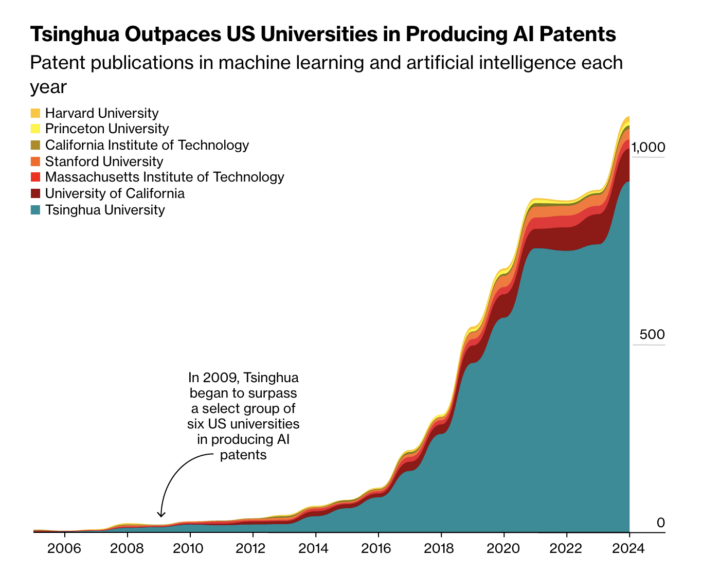 China’s prestigious Tsinghua University (sometimes called “Stanford, MIT, and Carnegie Mellon all rolled into one”) has become arguably the world’s leader in AI and ML, racking up almost 5,000 patents in those spaces since 2005—more than MIT, Stanford, Princeton, and Harvard combined. Tsinghua has more AI research papers among the 100 most cited than any other school; its only competition is Google and Microsoft. However, while Tsinghua churns out more AI patents, they’re not cited as often by future patents; Harvard and MIT, meanwhile, put out fewer but more ‘impactful’ patents.