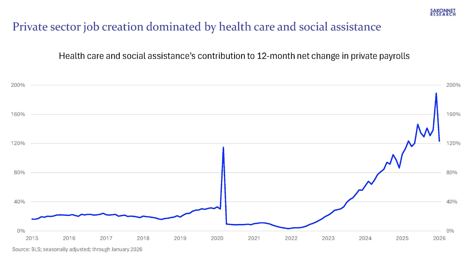 The US added 508,000 jobs in 2025, according to the latest numbers, but 405,000 of those gains came from healthcare and 308,000 from social assistance (which includes home health aides and childcare workers). Thus, the US lost jobs elsewhere and was saved only by these two industries. This pattern is common during recessions; indeed, 2025 was “the weakest year for job growth outside of a recession since the early 2000s.” Healthcare’s share of American job growth has been steadily increasing since 2022, perhaps a sign that elder care is becoming a load-bearing part of the economy as the US population ages.